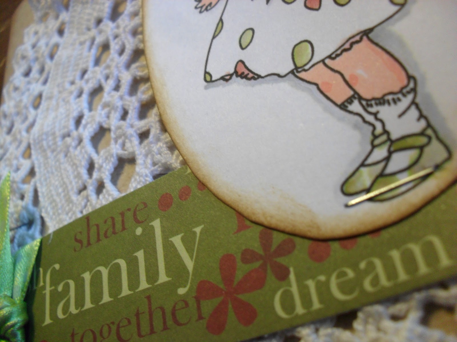 A small doily I got from a friend who wanted to clear out the linen closet of thing never used so it ended up on this card insted of being forgotten and neglected in a dark closet.