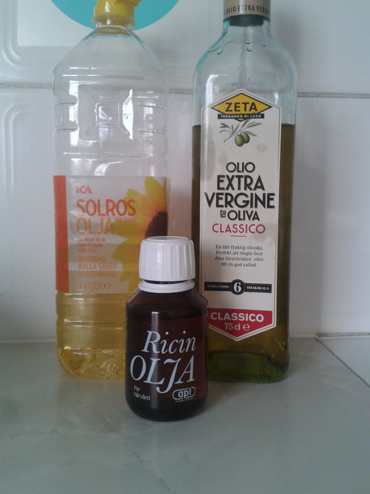 Gå till ett apotek och köp Ricinolja (kallas castor oil på alla engelskspråkiga sidor om du googlar det) och sedan ska du välja en annan schysst olja tex olivolja eller solrosolja (i vilken butik du vill) verkar vara de som anses vara snällt mot alla typer av hud. Välj gärna ekologisk olja om du hittar någon för det är ju bra att undvika besprutningsrester i din olja.