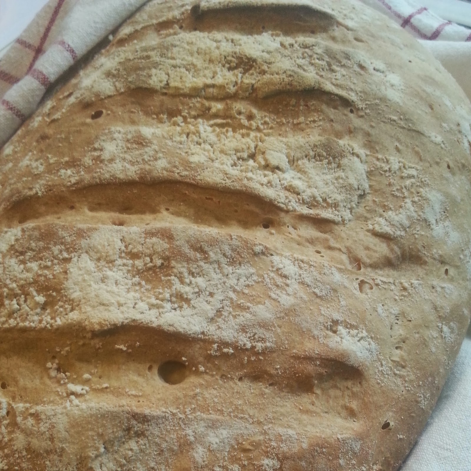 Detta bröd kan jästa 40 min – 2 timmar beroende på hur hungrig man är. Jag jäste det i två timmar och dottern sa att det smakar ciabatta – och det är ett bra betyg för hennes favoritbröd är ciabatta.